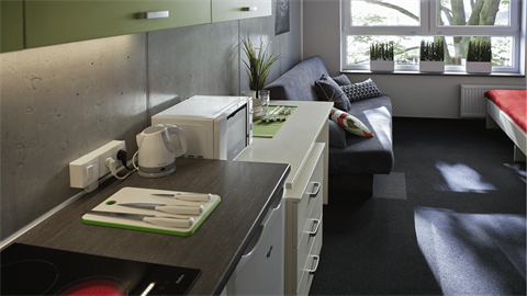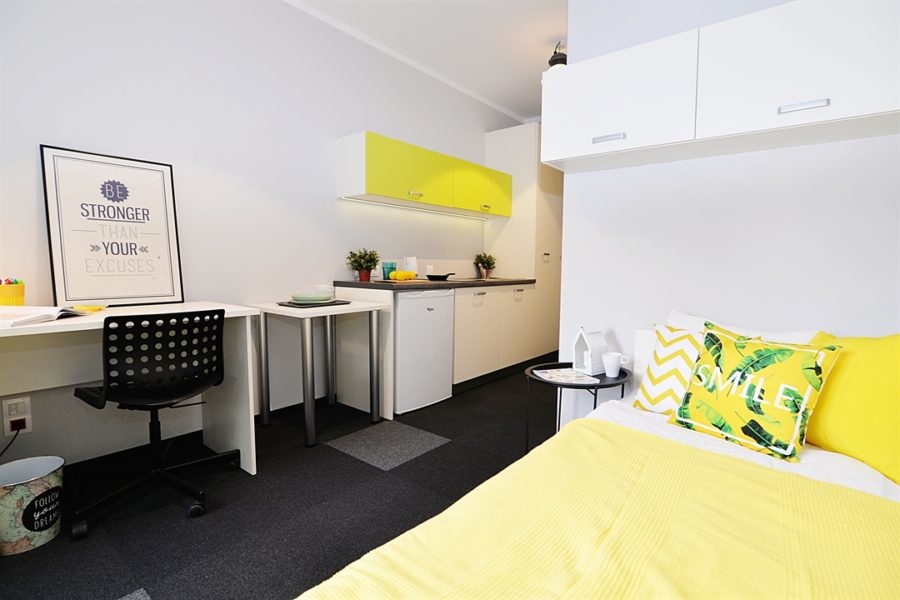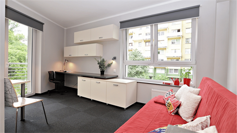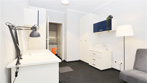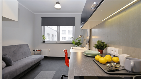 Studio jest w pełni umeblowane i posiada indywidualną łazienkę oraz aneks kuchenny. W akademiku znajdziesz wszystko, co jest niezbędne, aby poczuć się jak we własnym mieszkaniu, a jednocześnie blisko studentów z całego świata, którzy mieszkają w Student Depot w trakcie studiów lub programu Erasmus w Gdańsku.