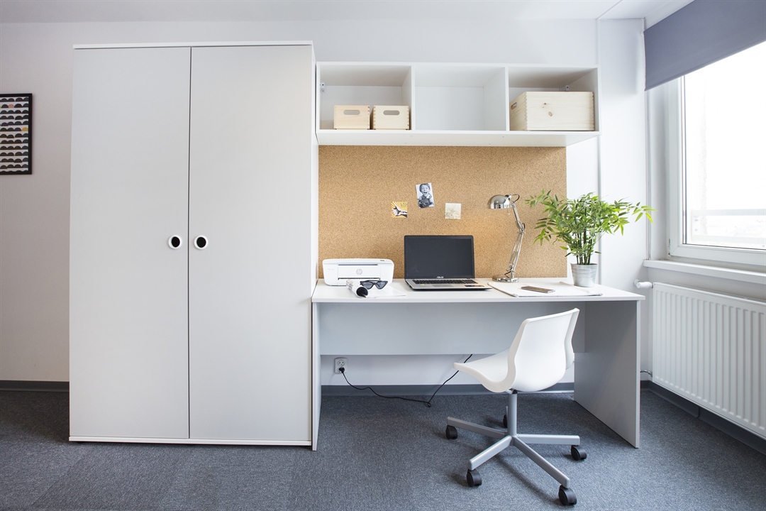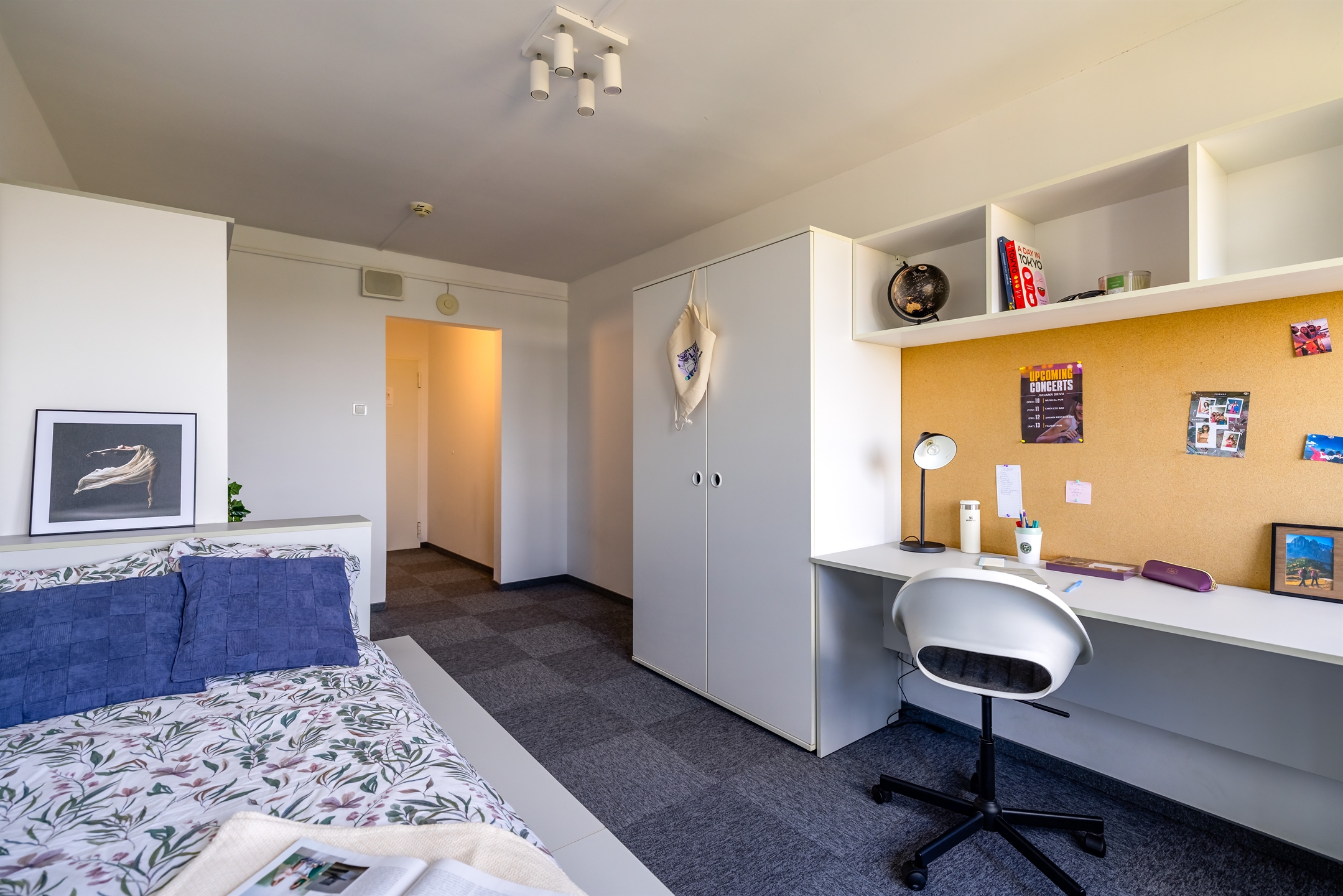Apartament jest w pełni wyposażony, zamykany na klucz, a dostęp do niego masz tylko Ty. Znajdziesz tu wygodne łóżko, biurko z krzesłem, szafę, półki na książki oraz aneks kuchenny z lodówką, czajnikiem i kuchenką mikrofalową – wszystko, czego potrzebujesz, by komfortowo mieszkać w centrum miasta. Wnętrze dopełnia miękka wykładzina, która tworzy przytulny klimat, idealny zarówno do pracy, jak i odpoczynku.
