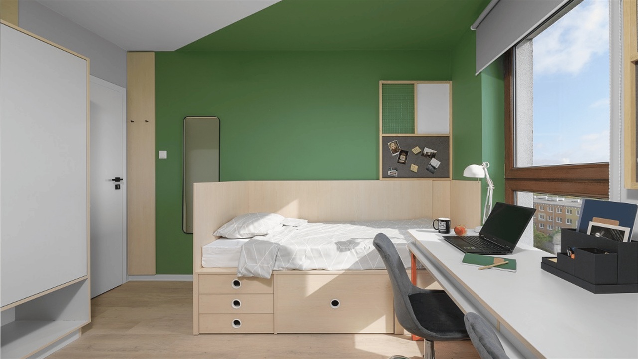 wygodne łóżko, biurko z krzesłem, szafa z bocznymi półkami i lustro. Przemyślana aranżacja sprawia, że pokój jest funkcjonalny i przytulny – w sam raz na naukę, odpoczynek i relaks po zajęciach.