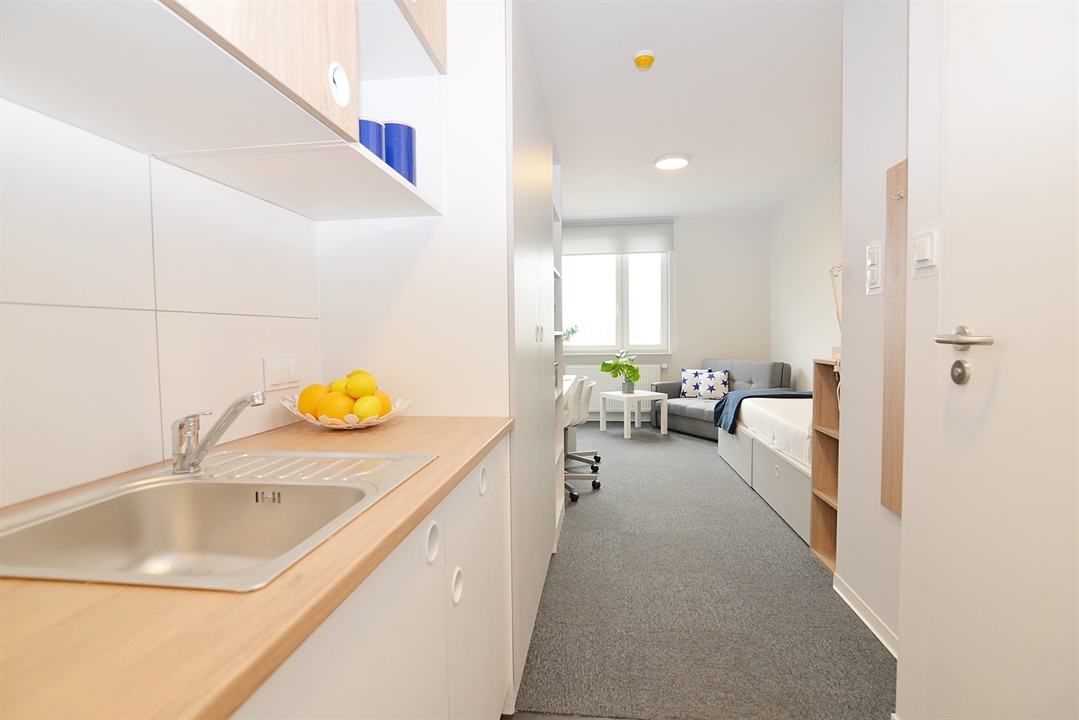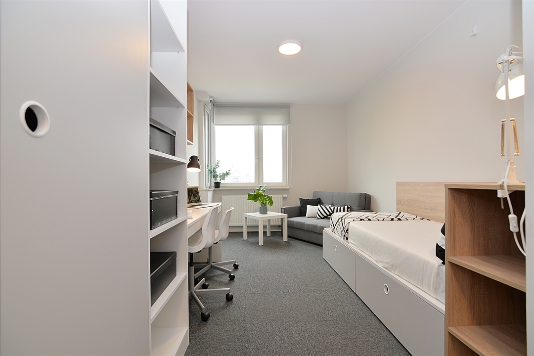 Na 22 m² znajdziecie wszystko, czego potrzeba, by uczyć się, mieszkać i odpoczywać w swoim tempie: pojedyncze łóżko, rozkładaną sofę, biurko z krzesłami, dużą szafę oraz wiszące szafki na najpotrzebniejsze rzeczy. Przytulna wykładzina dywanowa sprawia, że wnętrze zyskuje domowy klimat. Do dyspozycji macie również prywatną łazienkę z prysznicem oraz własny aneks kuchenny z płytą grzewczą, lodówką i mikrofalówką – wszystko tylko dla Was, zamykane na indywidualne klucze.